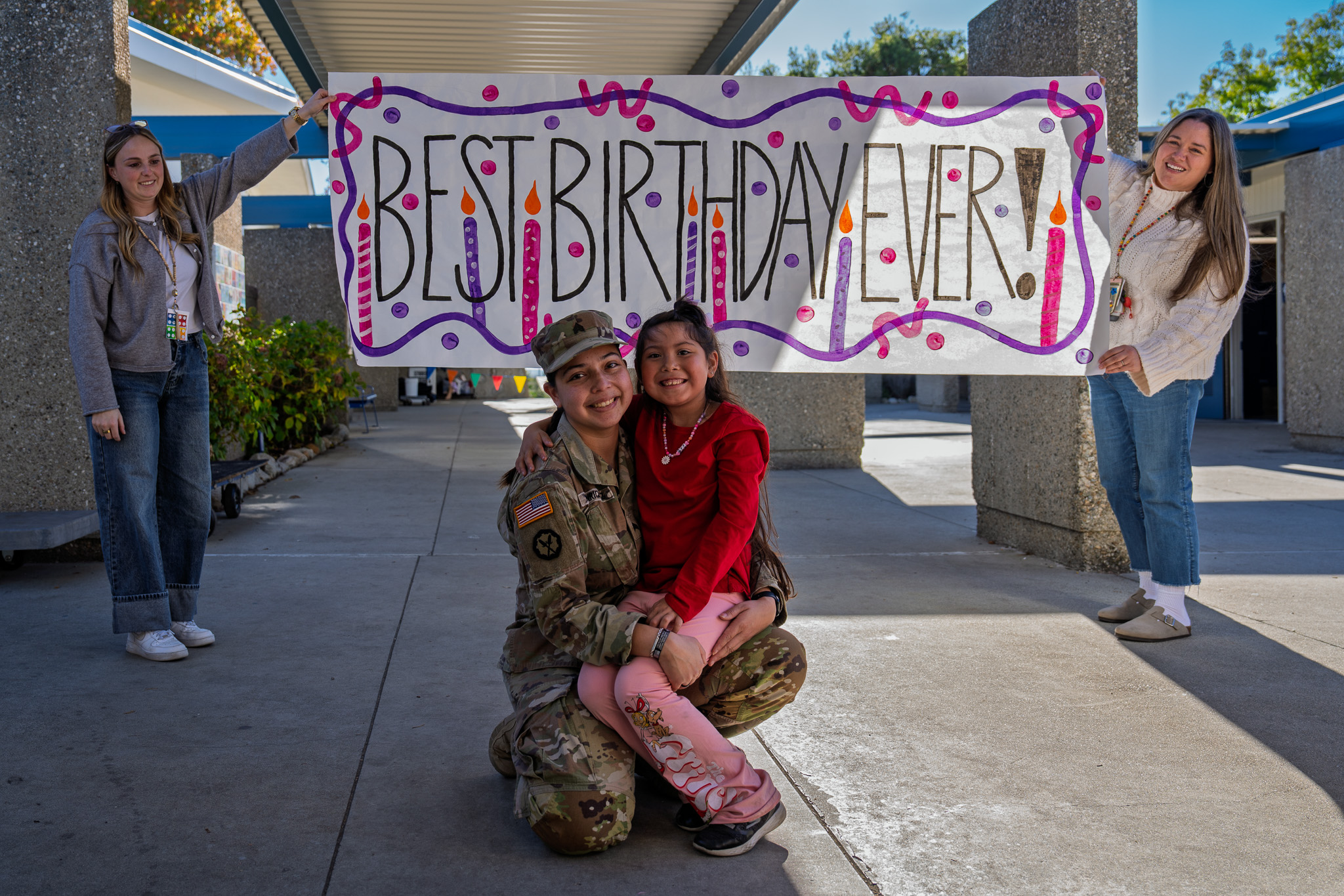 For Sgt. Manriquez, seeing her daughter surrounded by such a caring school community was incredibly meaningful. She shared how special it was to witness Aurora’s environment firsthand and to feel the warmth and support that Chaparral Elementary provides. The idea to surprise Aurora had been in her heart throughout her deployment, and once her return date was confirmed, everything aligned perfectly to make the moment happen on Aurora’s birthday.
