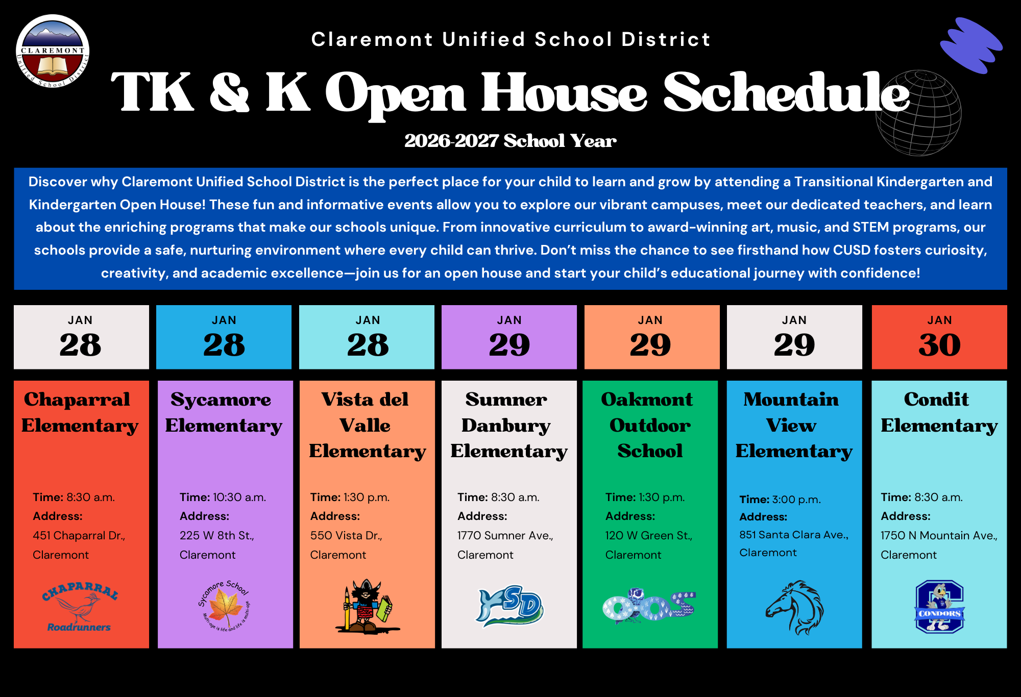 Claremont Unified School District is excited to welcome families to our TK and Kindergarten Open Houses taking place January 28 to 30, 2026. Each of our elementary schools will open its doors for engaging, campus-based events where families can meet teachers, explore classrooms, learn about enriching programs, and experience the welcoming environments that make CUSD a special place to begin a child's educational journey. From innovative instruction to vibrant art, music, and STEM opportunities, these Open Houses give families a firsthand look at how we nurture curiosity, creativity, and academic excellence.
